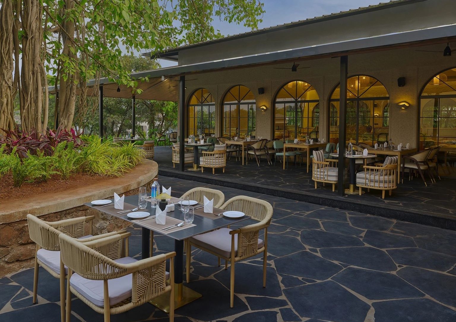 Indulge in a serene hi-tea experience beneath the wide, graceful canopy of a majestic banyan tree. Relish a charming spread of assorted finger sandwiches, freshly baked scones, cookies, mini quiches, and a variety of teas and cool refreshments. With service that is both caring and unobtrusive, this tranquil setting lets you unwind and soak in the peaceful ambiance - A perfect escape into nature’s embrace, where every sip and bite feels truly special.